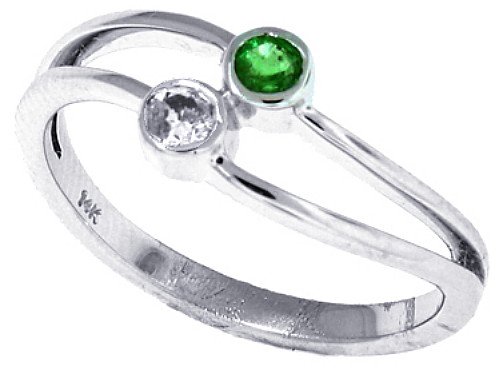RG1100-E. Rich round green emerald in a unique design is complimented with bezel set round diamond in lustrous 14kt white gold mounting. The May birthstone, along with the sparkling diamond and rich polished finish make this a simple and an elegant addition to your jewelry collection
