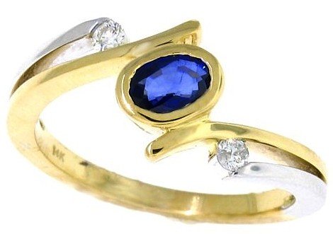 RG1119-S A single rich oval blue sapphire forms the centerstone in this elegant piece. With a single bright round diamond set on each side in lustrous 14kt two tone gold mounting, this ring is the perfect one for a casual right hand ring.