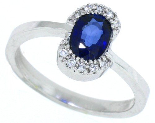 RG1157-S An amazing right hand ring with an oval shaped rich blue sapphire and prong set round brilliant diamonds in 14Kt White Gold. Give this ring for a birthday or graduation.