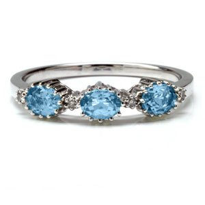 This is an exquisite ring, showcasing blue topaz, alternating with sparkling diamonds set in glossy 14k white gold.. 114-1392