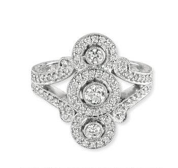 This fashion ring has three bezel-set diamonds buttoning the top of the two-part band of 76 more diamonds. Express your unique sprit with this 14k White Gold Butto 1/2 Ct Diamond Right Hand Ring.