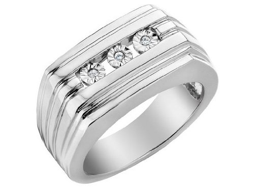 A classic accessory for him, this right hand ring is crafted in sterling silver and features a central trio of claw-set diamonds. Sleek and masculine, this classic ring will always be in style. SKU: 68PG4426