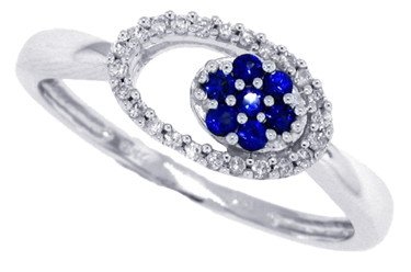 RG 1862-S Rich round blue sapphire in a beautiful flower design is surrounded with a circle of dazzling round diamonds which are prong set in lustrous 14kt white gold mounting. The september birthstone, along with the sparkling diamonds and rich polished finish make this an elegant addition to your jewelry collection.