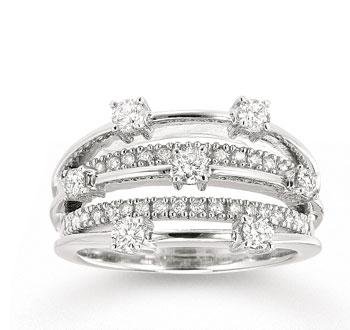 This fashion ring balances 7 diamonds beautifully multiple bands of white gold and 36 more diamonds. Express your unique sprit with this 14k White Gold Balanced .75Ct Diamond Right Hand Ring.