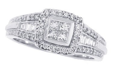 RGFP2416-10-D Gorgeous princess cut diamonds form a cluster at the center of this big look ring. The classic elegance of this style is enhanced by the round diamonds surrounding the princess cut diamonds and the brilliant baguette diamonds along both the sides. The 10kt white gold mountings in a polished finish add to the classic beauty of this right hand ring.