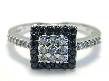 I love this beautiful, sparkling, contemporary ring! It features .50 ctw of round diamonds in both black and white. These are genuine, natural diamonds set in a square mounting and along the band. The setting is solid 10k white gold. The clear diamonds are SI-I1 clarity and HI in color. The crown of this ring is 9 mm (3/8 inch) tall. The ring weighs 3.3 grams and is a size 7, sizable by your local jeweler.