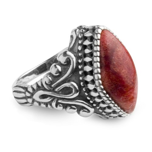 Diamond shaped red coral sponge is bezel set and intricate scrollwork adorning the shank make this ring daringly different. The deep carving of the silverwork gives this ring the added dimension and distinguishes finely made jewelry from ordinary items. Designer Carolyn Pollack uses bold color and contemporary design for a ring that's not for the faint of heart. Wear it or share it, ring measures 3/4" x 3/4". Proudly made in New Mexico, USA with fair labor. We do our part for the environment by handcrafting our jewelry from recycled genuine sterling silver.