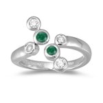 Your left hand lives for love. Your right lives for the moment. This beautiful right hand ring has four diamonds and two emeralds bezel set in a 14K White Gold ring. Total Diamond Weight 0.16 Carats. This product is sold by JEWELS-BY-SABRINA.,METAL:14K Gold,ACTUAL METAL:14K White Gold,RHODIUM:Yes,NUMBER OF DIAMONDS:4,SHAPE:Round,MINIMUM COLOR:H,MINIMUM CLARITY:SI,MINIMUM CARAT TOTAL WEIGHT:0.15,SETTING STYLE:Bezel Setting,GEMSTONE:Emerald,AVERAGE COLOR:Slightly Included,AVERAGE QUALITY:AA,MINIMUM CARAT TOTAL WEIGHT:0.18 cts,GEMSTONE DIMENSIONS:3 mm,SETTING STYLE:Bezel Setting,NUMBER OF STONES:2,COLOR:Green- White,GENDER:Womens,PRODUCT TYPE:Right Hand Ring,MATERIAL:Gemstone-White Diamond