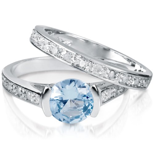 Traditional can sometimes become too traditional! This new approach on engagement rings is taking over. This ring set includes a 7x7mm brilliant round cut synthetic blue topaz stone that is surrounded by ten round cut diamonds that taper down the band of the ring. The ring set also includes a silver band ring that offers fourteen round cut diamonds that run along the face of the ring. This ring also has a rhodium plate finish and is available in sizes 6, 7, and 8!