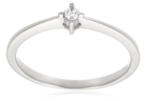The simplicity of a single diamond is the perfect way to seal your promise. This traditional promise ring is crafted in 10 karat white gold and showcases a small round diamond (.05 ct), held securely in a four-prong setting and centered on a slender band. This elegant style looks beautiful on its own and will complement her other rings without overshadowing them.