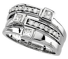 Lovely, sculpted piece with careful use of asymmetry in design. Three white gold bands elevate from a single shaft, with two of the bands inlaid with seven diamonds each in a rectangular bed of diamond light. Three larger diamonds rest in bezel frames on each band, adding complimentary shape and further light. This Diamond Ring is available in a Size 7. It can be resized up or down ONE full size at NO CHARGE. NOTE The very facets that create the beautiful sparkle in a loose gemstones or gemstones set in jewelry may create optical illusion white or dark/black spots and areas, or uneven coloring when a gemstone is photographed. This effect also applies to photographing highly reflective metals such as gold. Single dimension photographs can not accurately display the true beauty and life in a gemstone or gemstone jewelry. This Beautiful Diamond Ring must be seen in person to be appreciated.