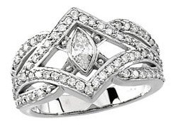 Classic, old world crafting that turns a crown into a ring. A full carat of diamonds adorn the ribbon-like bands that create the crown, with a very large marquise faceted diamond at the crown center. A powerfully engaging piece. NOTE The very facets that create the beautiful sparkle in a loose gemstones or gemstones set in jewelry may create optical illusion white or dark/black spots and areas, or uneven coloring when a gemstone is photographed. This effect also applies to photographing highly reflective metals such as gold. Single dimension photographs can not accurately display the true beauty and life in a gemstone or gemstone jewelry. This Beautiful Diamond Ring must be seen in person to be appreciated. There is no charge for sizing.